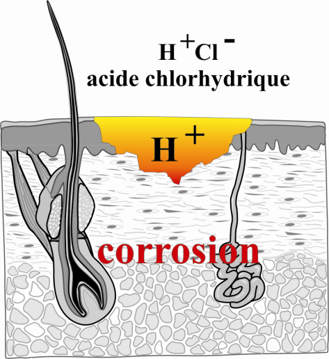 The destructive action of the acid mainly targets the superficial layers, whereas the fluoride ion does not damage them that much[1]. Then the devastation of these layers allows the HF and the fluoride ions that HF progressively releases to penetrate and to spread into the deepest tissues, resulting in liquefactive necrosis. This specific mechanism differentiates HF from other acids and particularly from strong acids which cause coagulation necrosis with precipitation of the tissular proteins[2].
